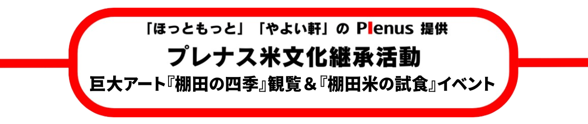 【午前の部】 10:00〜10:30:受付 10:30〜10:45:プレナス事業紹介 10:45〜11:15:「棚田」講座 11:15~11:45:巨大アート『棚田の四季』観覧(休憩を含む) 11:45~12:00:「棚田米の試食」体験 【午後の部】 14:00〜14:30:受付 14:30〜14:45:プレナス事業紹介 14:45〜15:15:「棚田」講座 15:15〜15:45:巨大アート『棚田の四季』観覧(休憩を含む) 15:45~16:00:「棚田米の試食」体験 |